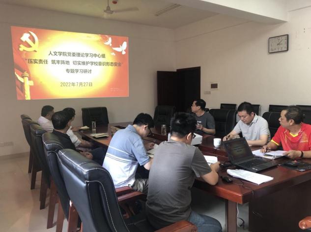 2022年7月27日,华体会注册大厅学院党委理论学习中心组在立言楼B505室开展“压实责任 筑牢阵地 切实维护学校意识形态安全”专题集中学习,集中学习由曾志东书记主持,全体党委委员和党政办负责同志参加了本次集中学习。