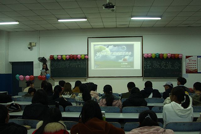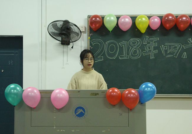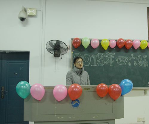 教室门口贴着精美的海报,教室内的黑板上挂着七彩的气球,黑板上则是漂亮的艺术字体,在精心布置的第八教学楼1-3教室里,我院于11月9日下午四点迎来了一年一度的英语四六级经验交流会。为助力即将到来的英语四六级考试,解答同学们的疑难困惑我院辅导员赵晗冰老师17级四级成绩优秀学生代表及17、18部分学生参加了本次经验交流会。