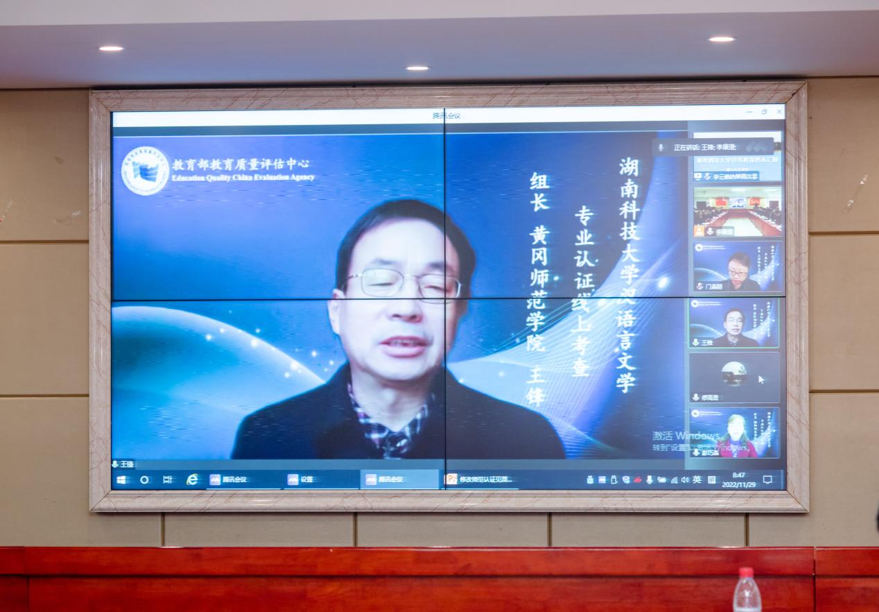 11月29日上午,华体会注册大厅汉语言文学师范类专业认证专家组见面会以线上的形式在立言楼4-1室召开。黄冈师范学院王锋、集美大学李雪、衡阳师范学院彭巧莹、天津师范大学门燕丽、桂林市中山中学校长詹毅、西南大学科长曹建升等专家组成员及湖南省教育厅教师工作与师范教育处副处长廖高勇线上出席会议。校长朱川曲、副校长贺泽龙、相关职能部门负责人、学校各师范专业负责人、华体会注册大厅负责人及中文系教师代表、承担汉语言文学专业基础课教学工作的相关学院教师代表现场出席见面会。见面会由专家组组长王锋主持。