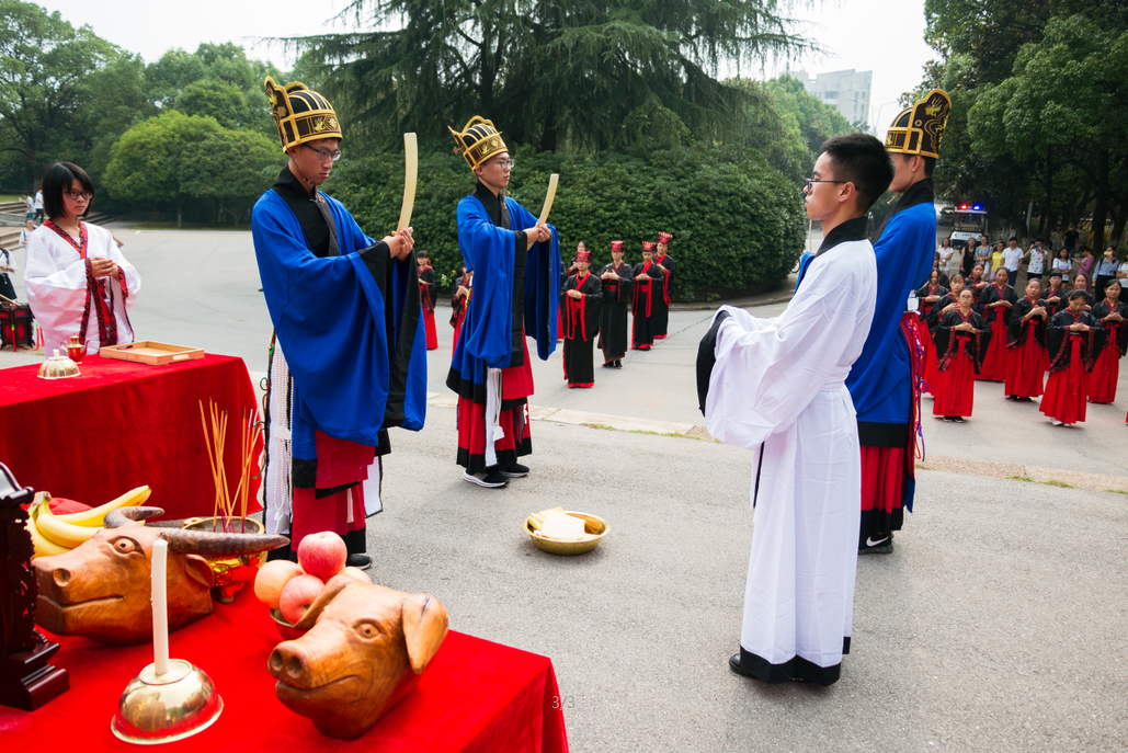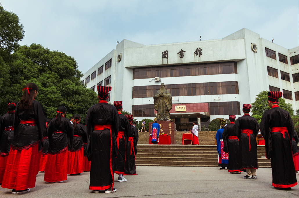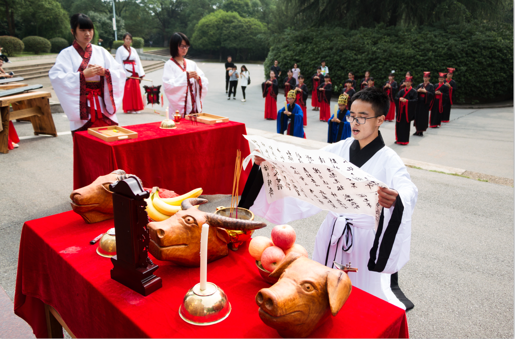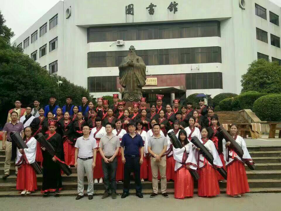 鼓声镗镗,琴声淙淙,舞袖翩翩,诵声朗朗。为弘扬传统文化,传承儒家思想精神,923上午,迎着微凉的晨风,由隐山哲学社主办,幽篁古琴社、古莲汉韵社协助办理的祭孔大典在北校图书馆前庄严开场。我院院长刘奇玉,历史系张晚林教授,思政系李育军教授,颜中军教授,朱学恩教授等领导老师到场,祭孔现场吸引了校内外观众前来观看。