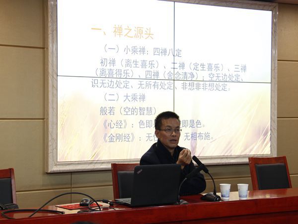 刘教授从禅的源头开始讲起,他运用形象的比喻阐释了禅学内部的种类差异,告诉我们,“小乘禅”是一个人的修行,而“大乘禅”是用“般若”的思想普度众生。而大乘佛教在中国流行的原因很大程度上在于其‘菩萨道’的思想与儒学‘己欲达而达人’的思想相契合。另外,刘教授用“禅宗之禅”的思想表明禅学提供了人们看世界的新视角,即在穿衣吃饭、挑水担柴等生活琐事中也可体悟禅意。在禅学的拓展方面,刘教授又从“士大夫禅”、“生活禅”、“人间佛教”三个角度对其进行深度解析。