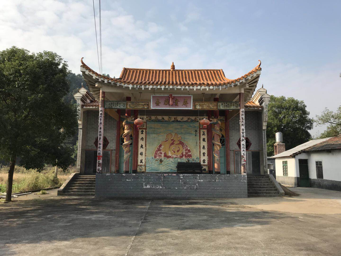 当日下午,考察团驱车前往竹中村实地考察李家宗祠以及祠堂内现存的一座清咸丰年间的古戏台。王奕祯老师结合现场为同学讲解了古戏台的相关知识,张晓燕老师则带领同学将戏台碑文逐一抄录下来,作为后续科研的宝贵资料。随后,考察团又马不停蹄赶往平都村,考察胡氏思荣公祠堂。祠堂内保留有一座清道光年间的古戏台。刘奇玉老师结合碑文对戏台和宗祠的概念做了进一步阐释,大大拓宽了随行同学的知识面和视野。