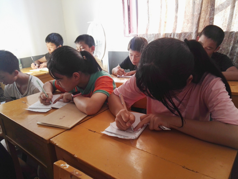 烈日下孩子们的脸颊上晕开一层层淡淡的腮红,但掩不住他们对我们的热情和期待,来到荷塘小镇的第一个下午我们便展开了准备已久的支教活动。“坐观垂钓者,徒有羡鱼情”,志愿者银文在课堂上为大家讲述的是诗人孟浩然求官的坎坷经历;“学而不思则罔,思而不学则殆”,志愿者伍园园在课堂上为大家讲述的是孔子的学习方法;志愿者李锦新则教着六年级的孩子们如何换算古代的货币......学习从来都是一件辛苦的事,教室如摆在火焰上的一架蒸笼,孩子们的汗水混着墨汁渗在作业本上,但脸上却洋溢着幸福的表情,仿佛在告诉志愿者们:“读书是一件快乐的事,你们便是给我们带来快乐的人”。