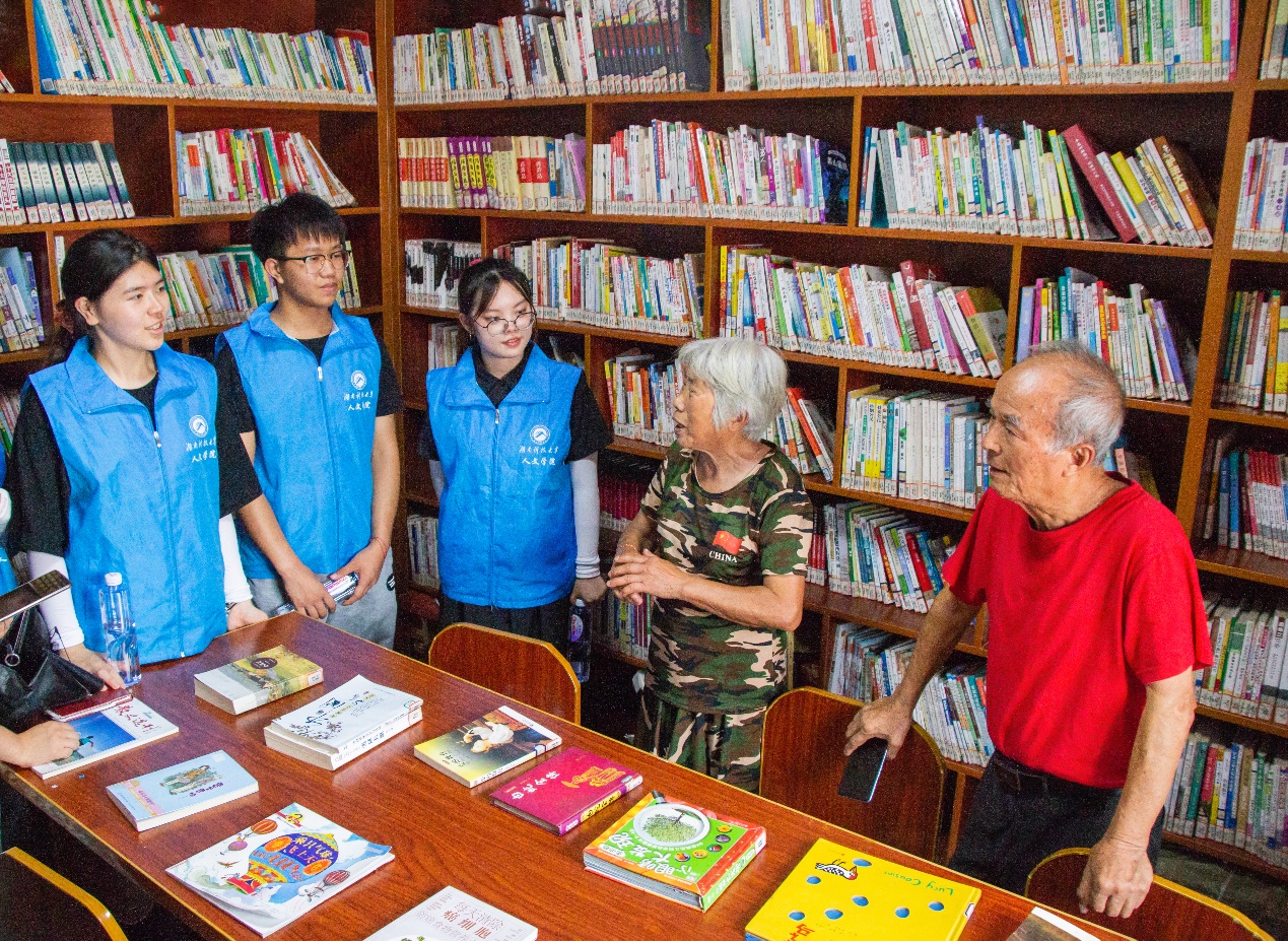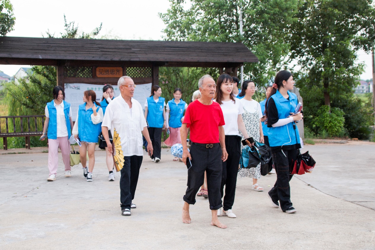 “哇,好多书啊!”志愿者们参观夏昭炎教授和杨莲金老师修建的书屋时不经感叹。这家小小看起来毫不起眼的书屋,里面却藏书上万册。它是闻名全国的攸县“门前三小”——小广场、小书屋、小讲堂的发源地。日落之前,夏昭炎教授带领志愿者熟悉周边环境并介绍乡贤文化中心特色——“门前三小”。门前三小工程是指家门的“小广场”“小书屋”“小讲堂”,其中小广场用于文体健身、小书屋用于书籍借阅、小讲堂用于基层宣讲。接着,志愿者们依次参观了民俗馆,图书馆,农家书屋等特色地点。