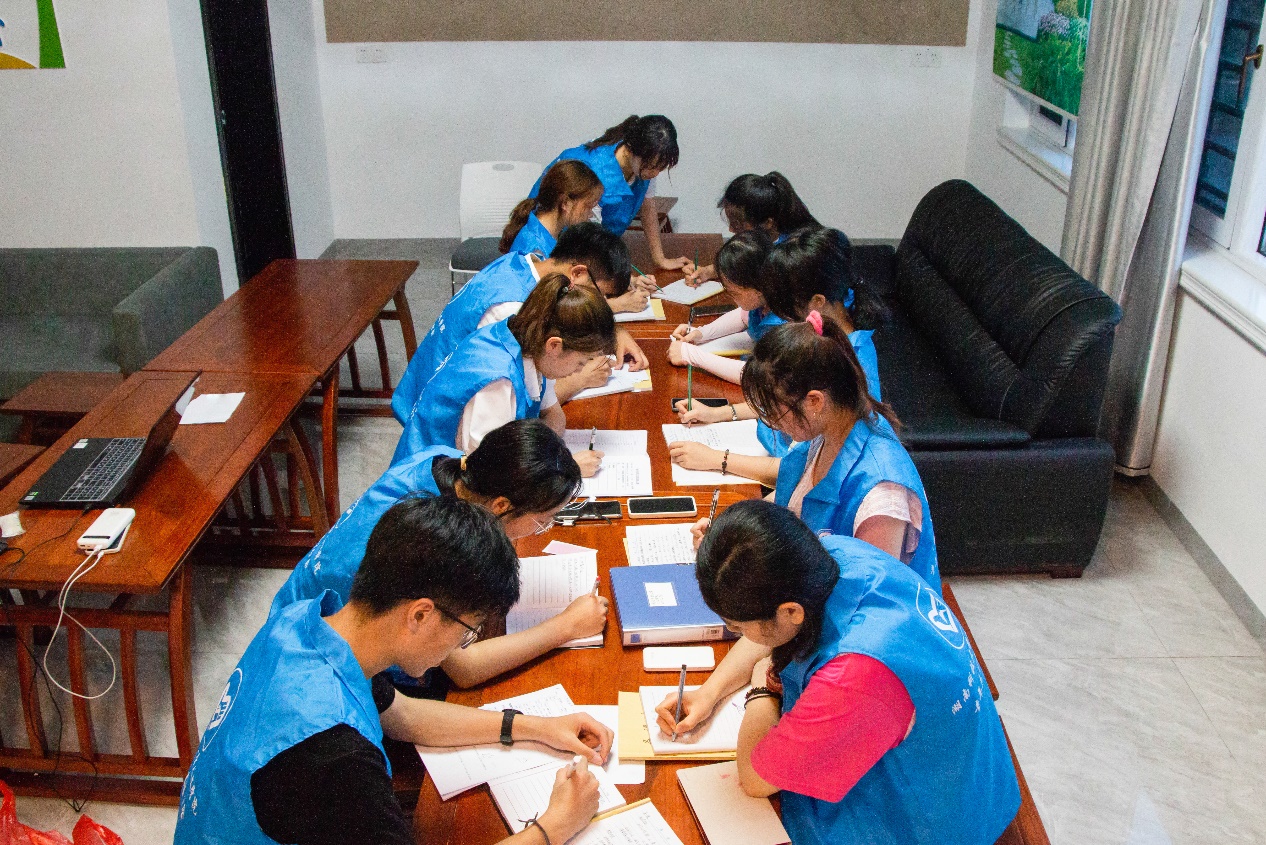 "嘀嘀、嘀嘀……",六点的闹铃一响,志愿者们迅速起床洗漱。早饭后,他们沿着两侧布满牵牛花、狗尾巴草的小道来到教学点。华体会注册大厅团委书记曾思妍说:“在昨天了解当地留守儿童、教学环境等情况之后,我们便组织开会为各个班级分配了班主任及科任老师,要求各位志愿者提前备课,以确保今天的的教学顺利进行,让留守儿童感受来自青年志愿者们的温暖与关怀。”