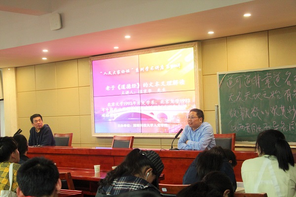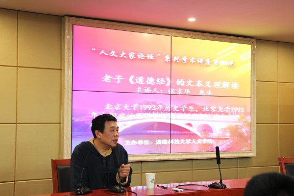 4月17日晚,湖南科技学院张京华教授应邀前来我校华体会注册大厅做了一堂题为“老子《道德经》的文本义理解读”的精彩学术报告。本次讲座由我院党委书记廖加林教授主持,我院吴广平教授、王友胜教授、张晚林教授、颜中军、胡忆红、余霞、胡红梅、龚超等老师及文、史、哲等专业的100多为本科生、硕士研究生到场聆听。