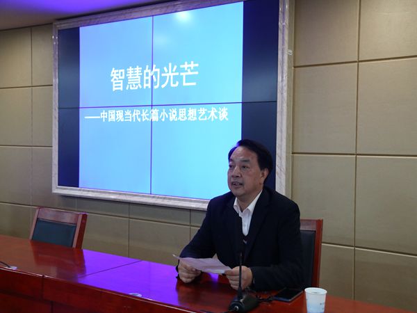 1112日晚,我院诚邀四川大学文学与新闻学院陈思广教授于立言楼B4-1举行以“中国现当代长篇小说思想艺术”为主题的讲座。讲座由我院彭在钦教授主持,吴投文、张晚林、刘郁琪、胡志明等老师以及16级文学专业全体同学到场聆听。