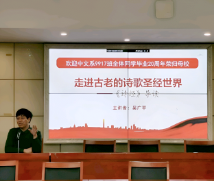 吴广平老师对9917班返校校友表示热烈欢迎,并以“走进古老的诗歌圣经世界—《诗经》导读”为题为9917班校友和23110103班学生再上一堂课。他通过对两则《诗经》的解读告诉在场的学生们,我们做人最重要的就是要尊重长辈,尊敬父母,要懂得报答父母。同时要坚持人与自然和谐发展,热爱自然,亲近自然。